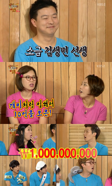 13일 방송된 KBS 2TV '해피투게더3'에서는 '연예계 대표 짠돌이' 김생민, 박현빈, 조갑경, 엠블랙 이준, 성대현이 출연했다.