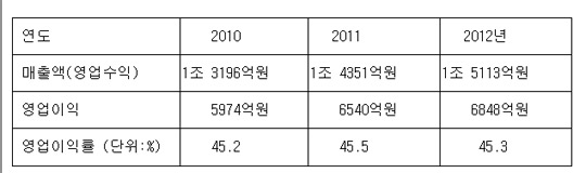 NHN은 개별기업 재무제표 기준으로 2012년 한해에 45.3%의 상상을 초월하는 영업이익률을 기록, 2년 연속으로 국내 상장 기업 중 최고를 차지했습니다. 다시 말해 NHN은 1000원어치를 팔면 각종 비용을 모두 제하고도 453원을 영업 이익으로 남겼다는 것입니다.